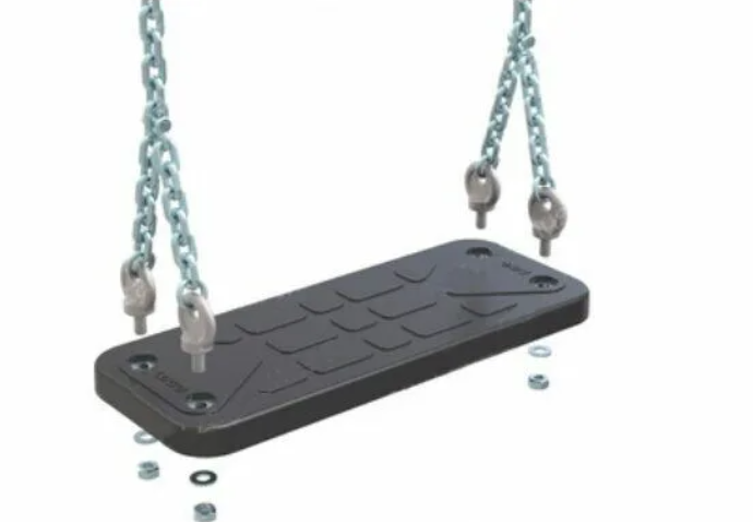 - Сиденье для классических качелей (габаритный размер — 440х175х25 мм.) Изделие состоит из алюминиевой пластины, сверху покрытой термоэластопластом. За счёт металлической закладной сиденье отличается прочностью и выдерживает повышенные нагрузки. Изделие имеет антискользящую поверхность. В качестве подвесов используются цепи из нержавеющей стали (с термоусадкой). Качели подходят для использования на уличных детских площадках или в помещении.