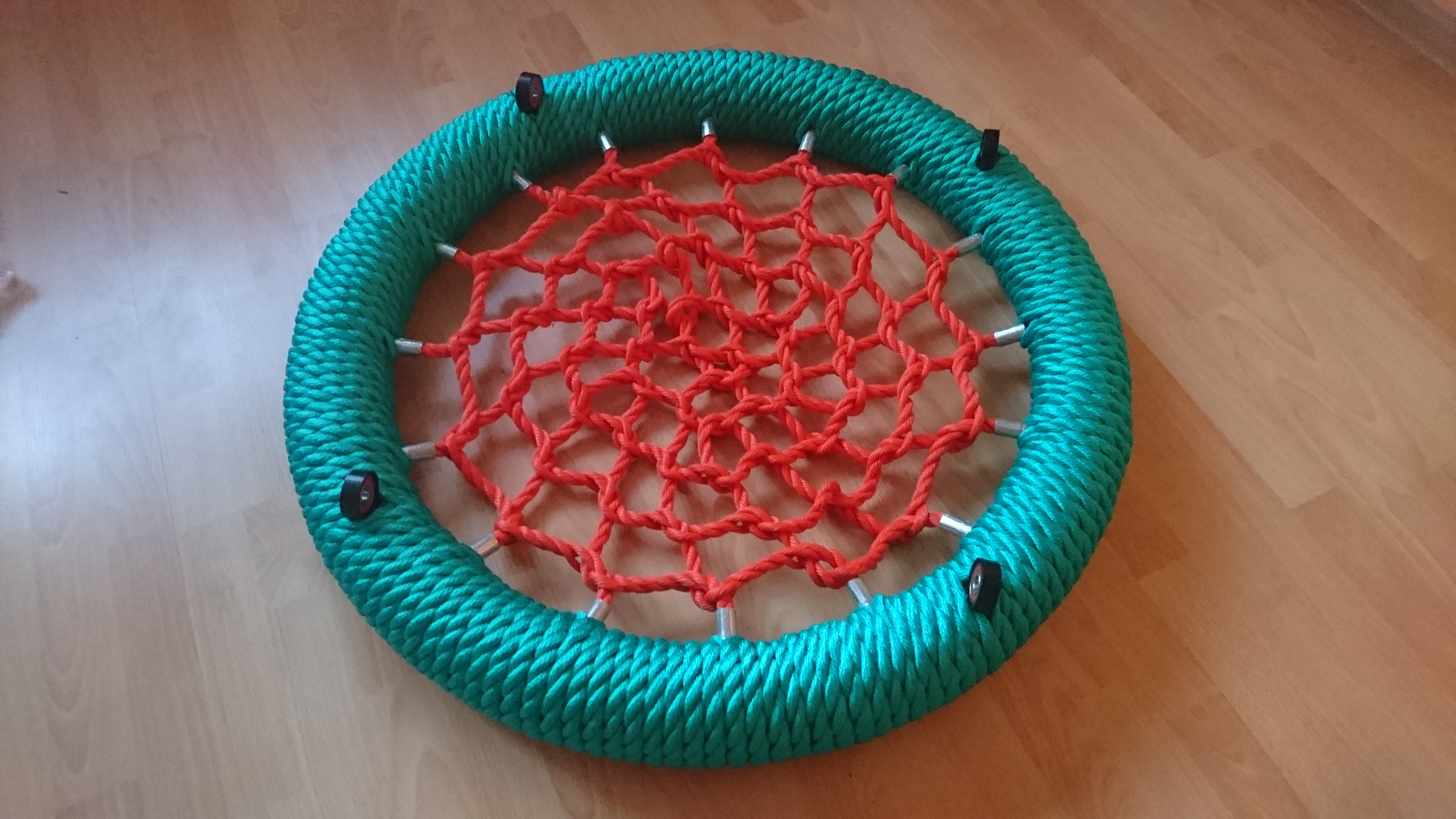 Сиденье (сеть) сплетено из кручёного трёхпрядного каната толщиной 14 мм, разрывная нагрузка на канат более 1200 кг ; Каждый конец сети опрессован специальной муфтой, в которой закреплено шарнирное соединение для крепления к основанию (ободу), это гарантирует отсутствие узлов крепления сети.